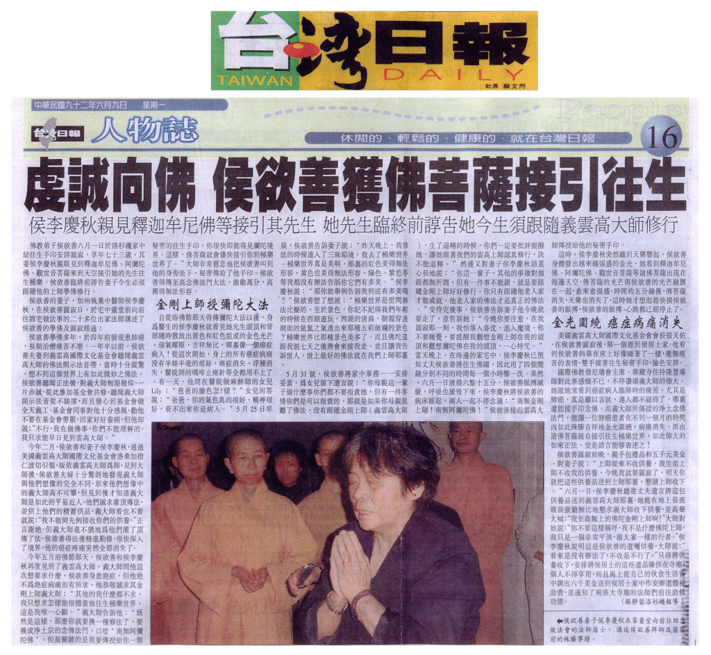 佛教弟子侯欲善六月一日於洛杉矶家中结往生手印安详圆寂,享年七十三岁,其妻侯李庆秋亲眼见到释迦牟尼佛、阿弥陀佛、观世音菩萨来到天空接引她的先生往生极乐。侯欲善临终前谆告妻子今生必须跟随他的上师学佛修行。