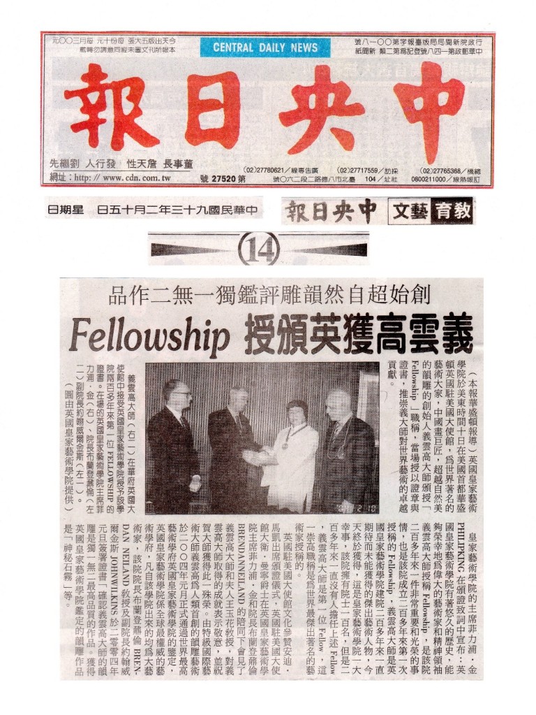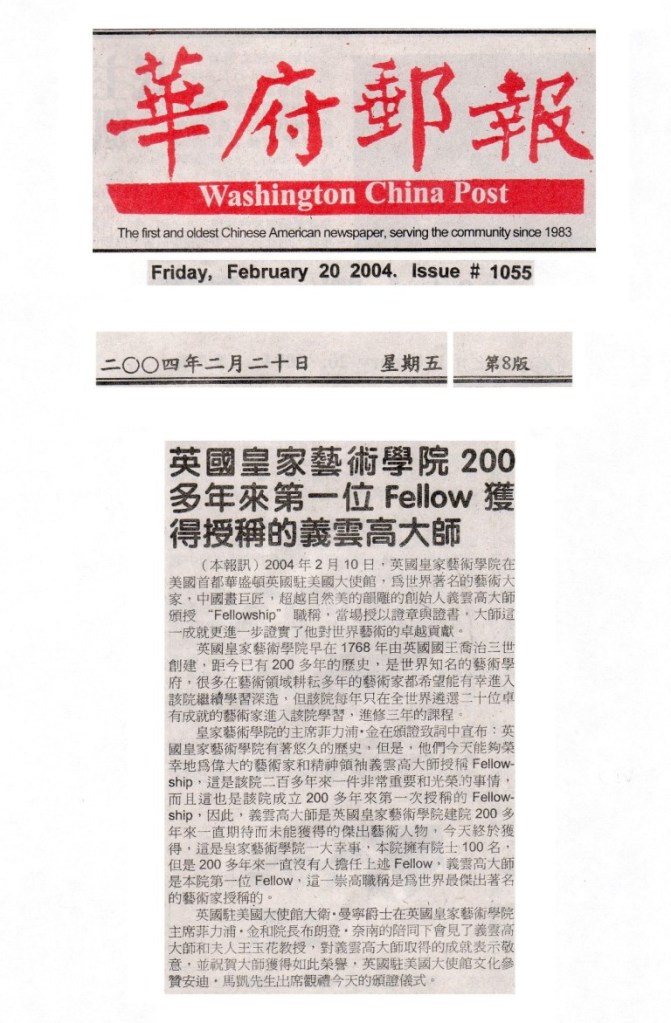 (本报讯) 2004年2月10日,英国皇家艺术学院在美国首都华盛顿英国驻美国大使馆,为世界著名的艺术大家,中国画巨匠,超越自然美的韵雕的创始人 义云高 大师颁授“Fellowship" 职称,当场授以证章与证书,大师这一成就更进一步证实了他对世界艺术的卓越贡献。