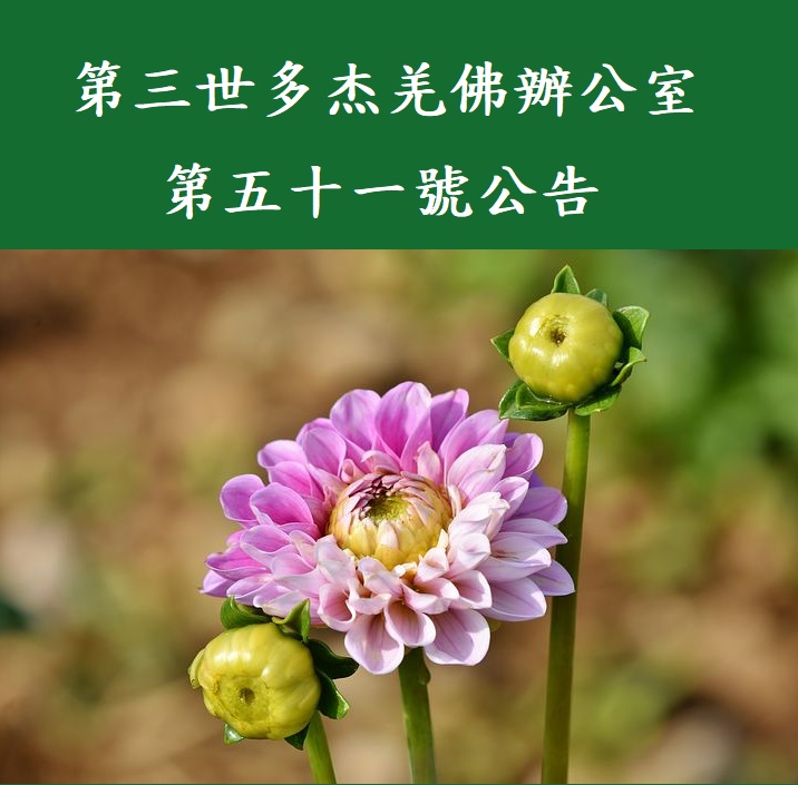 現在很多人準備今年六月份到美國來,慶祝南無 第三世多杰羌佛 的佛誕,對於這件事,H.H. 第三世多杰羌佛 要辦公室特發此公告,佛陀說:“今天主要是說一下我生日的事,一提到這件事,我就很慚愧,我何德何能受大家萬里來朝恭敬。希望今年你們不要再來,你們就在當地放生、幫幫孤老人和困難、需要救濟的人,只要你們愉快、高興了,這就是真正祝賀我的生日!!而且也許六月份我會出國旅行,你們來白跑一趟,我怎對得起大家?尤其是從國外趕來的人,特別是有些老人家,不但鶴年高齡,還身體欠佳,而且生活經濟有壓力,好不容易來了,我又不在,如何是好?至於你們要修行學佛,就按網上發的《 解脫大手印 》的《最勝菩提空行海心髓》或《暇滿殊勝海心髓》,按照其中一心髓實施,把《學佛》一書學通實用,一定會成熟好緣起,我會為你們灌頂傳法,不要你們任何供養,但要你們利益社會、利益大眾、慈悲眾生,諸惡莫作,眾善奉行。”