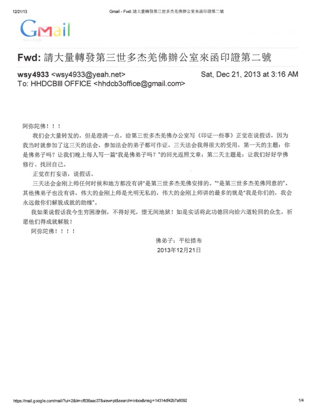 第三世多杰羌佛辦公室第四號來函印證 (12/21/2013)