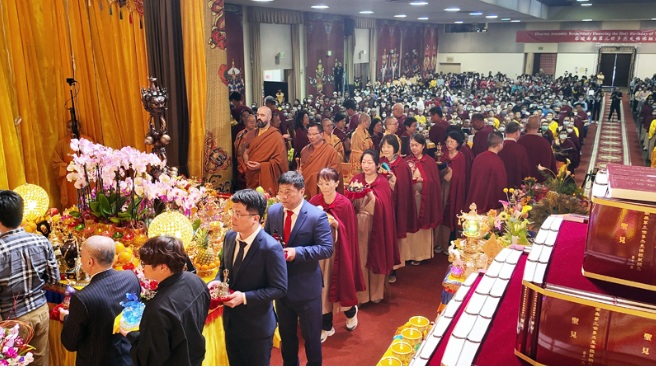 此經文是佛法真諦正見的根本經典,自發表以來即廣受僧俗二眾推崇,為現代佛教修學者的重要依止聖典。與會者神情專注、誦經聲整齊一致,震盪禮堂,句句感人至深。隨後,舉行佛前大供,展現對南無 第三世多杰羌佛 與十方諸佛菩薩至誠的敬意與供養。